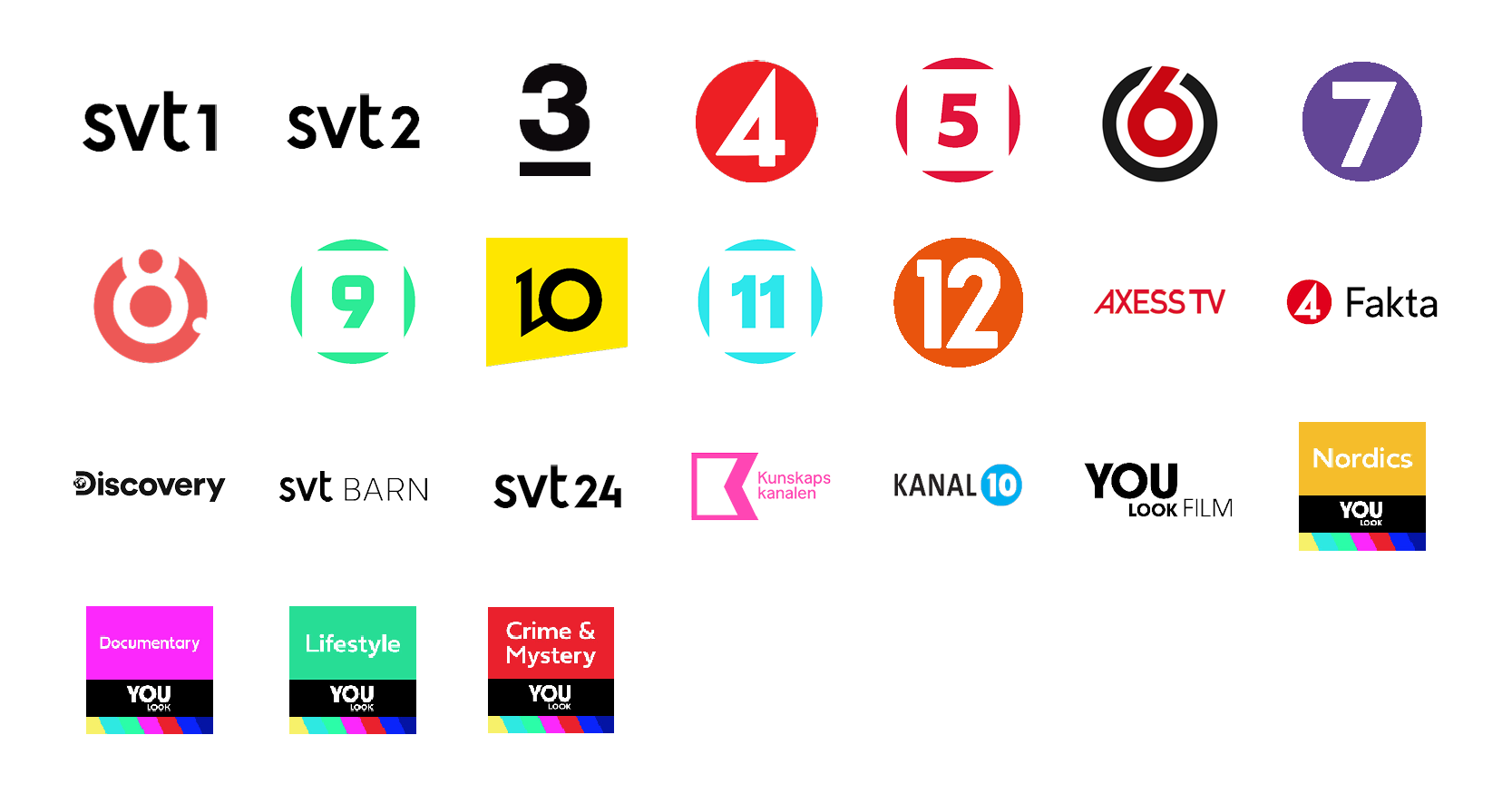 19 kanaler som tillsammans innefattar såväl grundkanaler, nyhetskanaler och sport, såväl som fakta- och barnkanaler.![]()