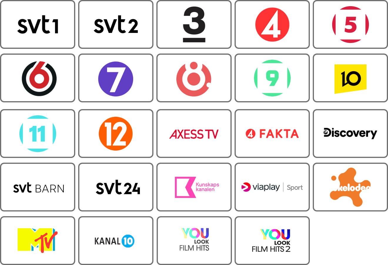 Flera kanaler som tillsammans innefattar såväl grundkanaler, nyhetskanaler och sport, såväl som fakta- och barnkanaler.