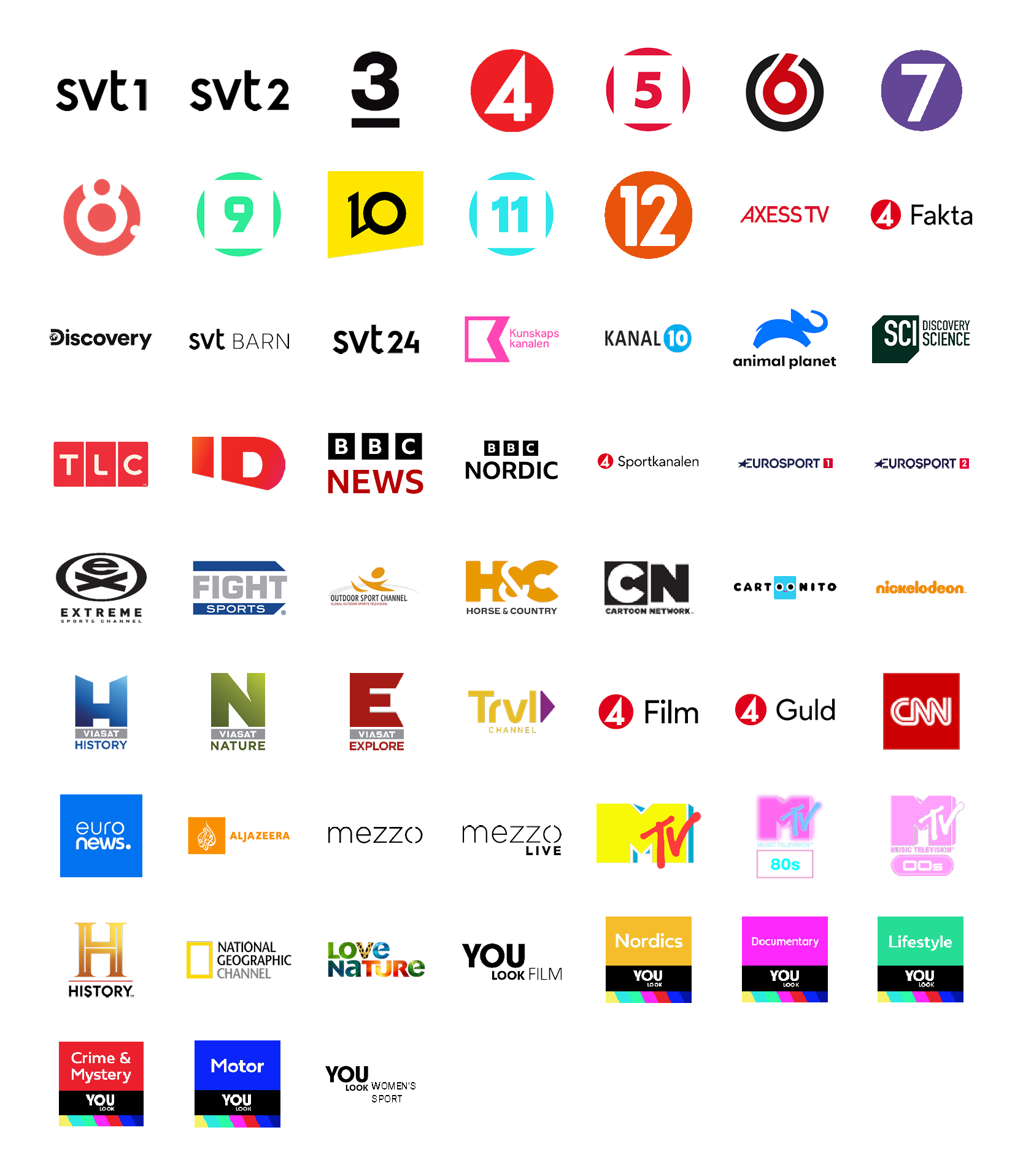 53 kanaler som tillsammans innefattar såväl grundkanaler, nyhetskanaler och sport, såväl som film-, fakta,- och barnkanaler.